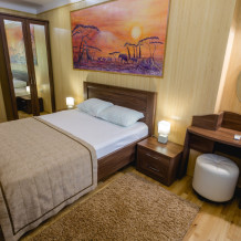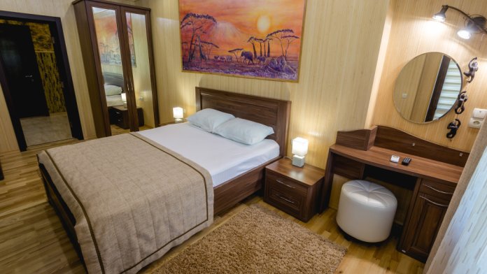 Просторные дизайнерские покои премиум-класса, выполненные в гармоничном морском стиле. Наличие двух полноценных комнат и просторная площадь в 100 м2 позволяют остановиться в покоях одновременно 4 людям. Покои удобно и дорого обставлены, оборудованы всем необходимым для комфортного проживания: полным комплектом мебели, новыми телевизорами, Wi-Fi. На кухне есть холодильник, микроволновка, электрический чайник, духовка и электро плита. Два больших санузла оборудованы душевой кабинкой, ванной и стиральной машиной. С просторной террасы покой открывается потрясающий вид на парковую зону и море.