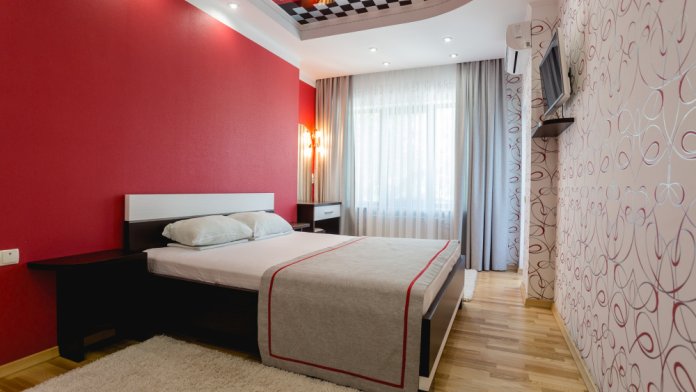Мебель: двуспальная кровать, прикроватные тумбочки, диван, платяной шкаф, стол, стулья, балкон, удобная и дорогая обстановка. Просторный санузел с душевой кабинкой и стиральной машинкой-автомат.