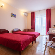 Однокомнатный двухместный номер с балконом, расположен на втором этаже. В номере две односпальные кровати, одноместный раскладной диван, шкаф, журнальный столик, вешалка. А так же холодильник, телевизор, кондиционер, туалет и душевая кабинка.