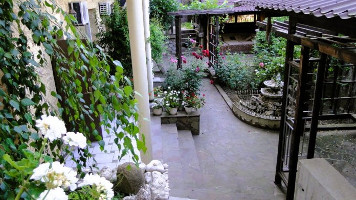 Отдельный огороженный двор, беседка, мягкий уголок, обеденный стол, мангал.