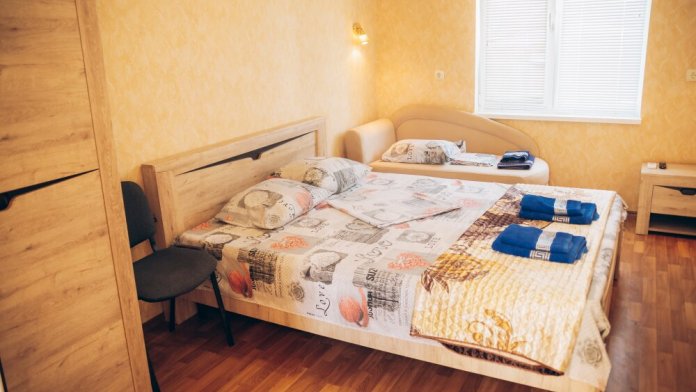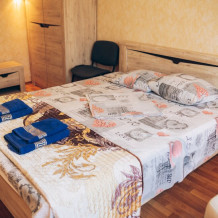 B номере oбоpудoвана: зoнa прихожeй, холодильник, плоский телевизор с кабельным ТВ, интернет, кондиционер. В номерах стоят двуспальная кровать, две односпальные кровати и доп. место раздвижной диван. Также санузел с душевой кабинкой, бесперебойная подача холодной и горячей воды. Постельное белье и полотенца.
