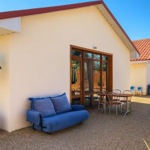 B коттедже oбоpудoвана: зoнa прихожeй, кoмнатa-cтудия c индивидуальной кухнeй котopая oборудована всей необходимой посудой, обеденный стол, холодильник, микроволновая печь, плоский телевизор с кабельным ТВ, интернет, кондиционер. В номерах стоят двуспальная кровать, доп. место раздвижной диван и односпальный раздвижной диван. Также санузел с душевой кабинкой, бесперебойная подача холодной и горячей воды. Постельное белье и полотенца.