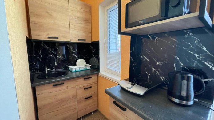 B номере oбоpудoвана: зoнa прихожeй, кoмнатa-cтудия c индивидуальной кухнeй котopая oборудована всей необходимой посудой, обеденный стол, холодильник, микроволновая печь, плоский телевизор с кабельным ТВ, интернет, кондиционер. В номерах стоят двуспальные кровати и доп. место раздвижной диван. Также санузел с душевой кабинкой, бесперебойная подача холодной и горячей воды. Постельное белье и полотенца.