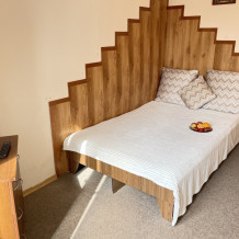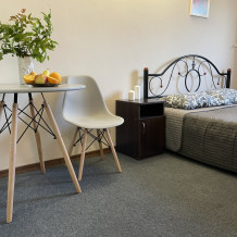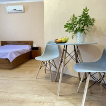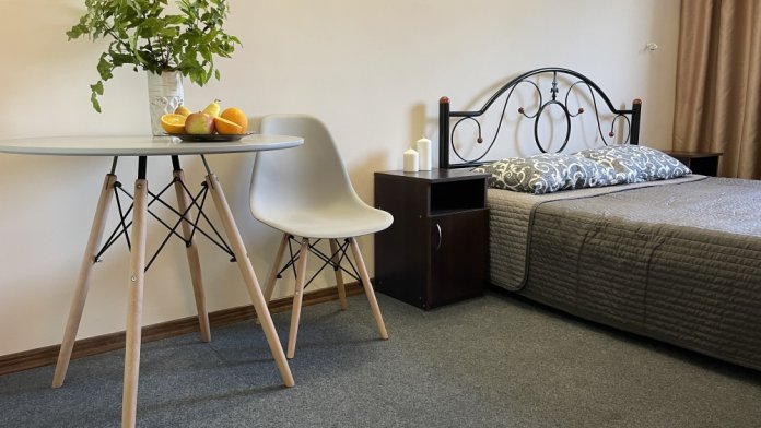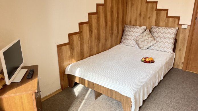 В номере телевизор SmartTV, кондиционер, холодильник, WiFi, шкаф для одежды, стол, 2 стула.