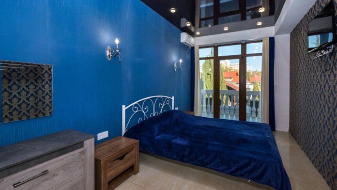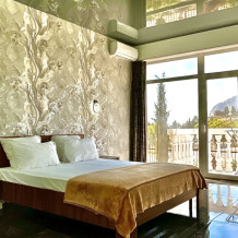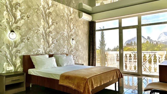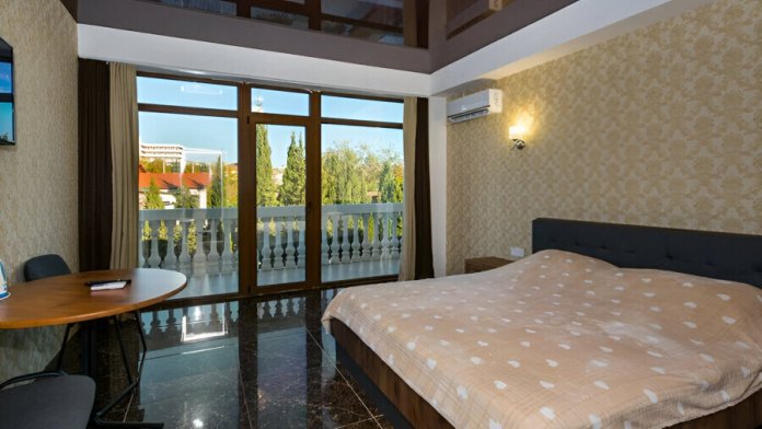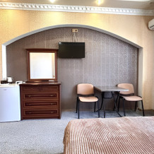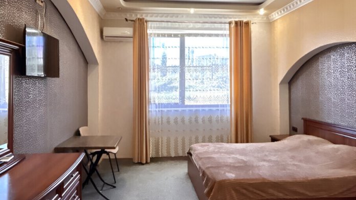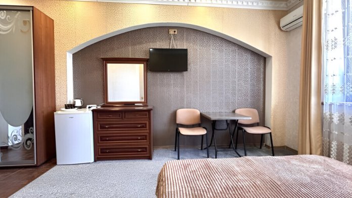В номере: телевизор с плоским экраном, шкаф, холодильник, удобная двуспальная кровать, кондиционер, Wi-Fi, полотенца, тапочки.