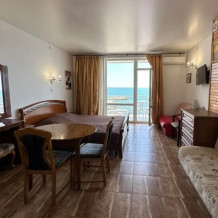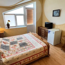 Номер расположен на 2-м этаже. Номер с большим балконом и видом на море. Отдельный вход со стороны моря (винтовая лестница). В номере кровать (спальное место 160 см), угловой раскладной диван. Также в номере есть: кухня, с необходимой посудой эл. плитой и эл. чайником, телевизор, кондиционер, холодильник, санузел (душ,туалет), горячая и холодная воды круглосуточно. Номер предназначен для 2 человек, с возможностью размещения 1 человека на дополнительном месте.