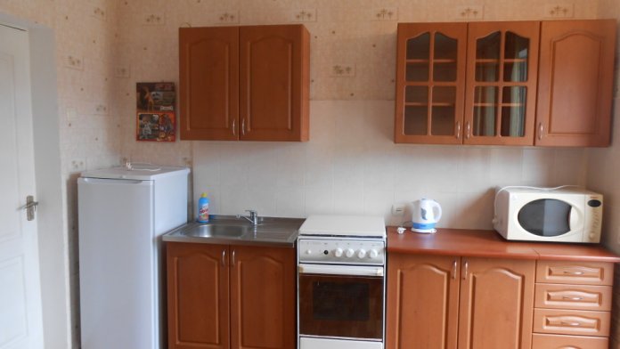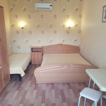 Номер состоит из комнаты, кухни, прихожей и санузла с душем. В комнате кондиционер, двуспальная и полуторная кровати, шкаф, тумба. Возможна установка 4 спального места. В кухне есть газовая плита, холодильник, электро-чайник и набор посуды (кастрюля, сковорода, тарелки, чашки, ложки, вилки). Предоставляются также постельное белье, лицевые полотенца, туалетная бумага и мыло. Номера расположены на первом этаже и имеют автономный вход со двора.