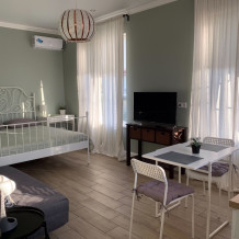 На территории расположено 4 дизайнерских апартамента, каждый в своем индивидуальном стиле. Апартаменты оснащены подачей горячей/холодной воды, электрическим чайником, микроволновкой, электроплитой (по запросу), холодильником, телевизором, кухонными принадлежностями, постельным бельем и полотенцами (бесплатно меняем каждые 5 дней). Вход в апартаменты индивидуальный, с выходом в патио или на террасу.
