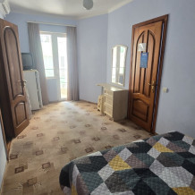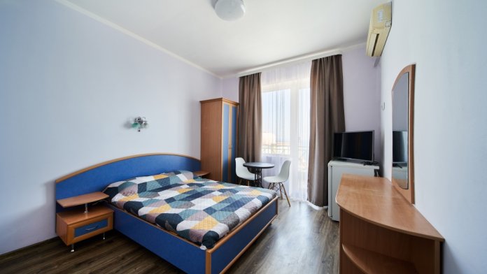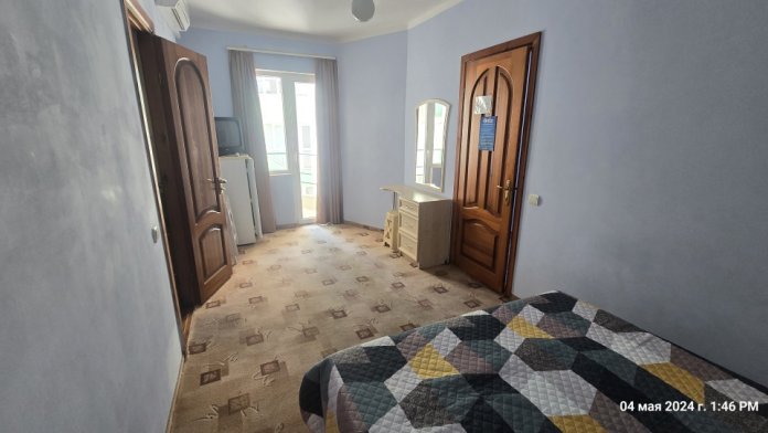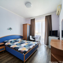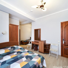 Номер семейный -двухкомнатный номер,с видом на соседнее здание с одним санузлом на две комнаты. Общая площадь номера – 40 м.кв. Номер разделен на две отдельные комнаты. В каждой комнате двуспальная или две полуторные кровати ,шкаф,, трюмо, , кондиционер, телевизор, холодильник. Также в комплектацию номера входит чайник столовые приборы, чашки, тарелки и фен. *Имеется вариант размещения до 6 человек, с дополнительными полуторными кроватями, уточняйте при бронировании. Отель не гарантирует номер с балконом! Смена постельного белья через каждые пять дней, смена полотенец раз в три дня.