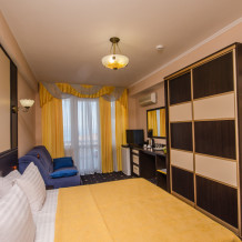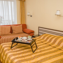 Номера выходят на южную сторону. Здесь всегда светло и по-южному тепло. Для комфортного отдыха вдвоем номер располагает всем необходимым. Это балкон с чудесным видом, кондиционер для создания прохлады, полный пакет телеканалов.
