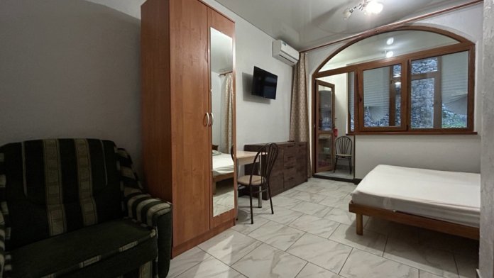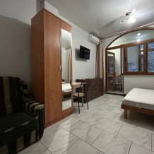 Расположен на прохладной теневой стороне дома. Полностью оборудован для проживания, с собственной отдельной кухней на балконе (холодильник, плита, эл. чайник, раковина, посуда, приборы). При заселении предоставляется посуда, постельное бельё, полотенца, средства гигиены.