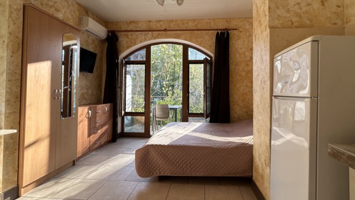 Номер-студия на 3 этаже четырёхэтажного гостевого дома. Солнечная сторона, собственный балкон со столиком и стульями, всегда есть возможность посидеть на солнце, спрятаться в тени виноградной лозы.