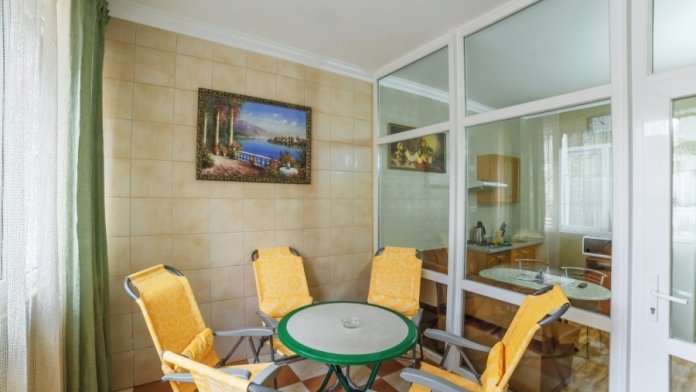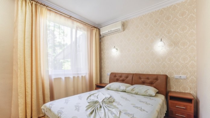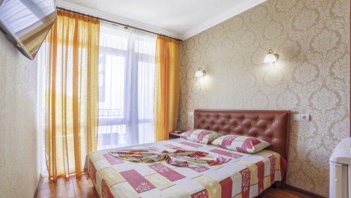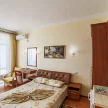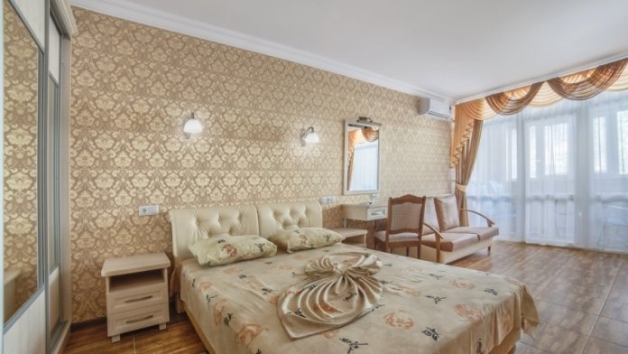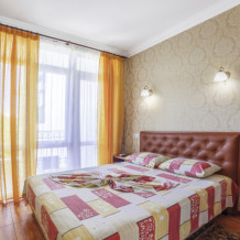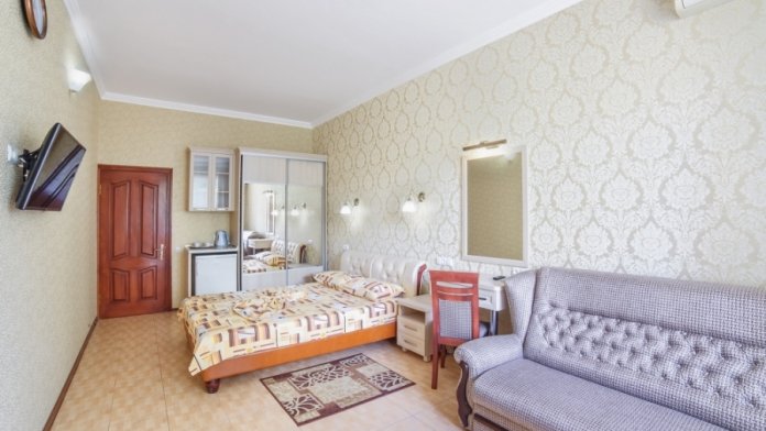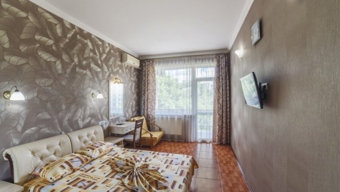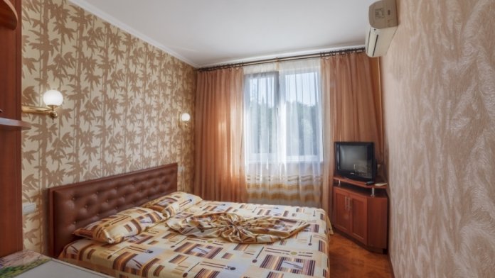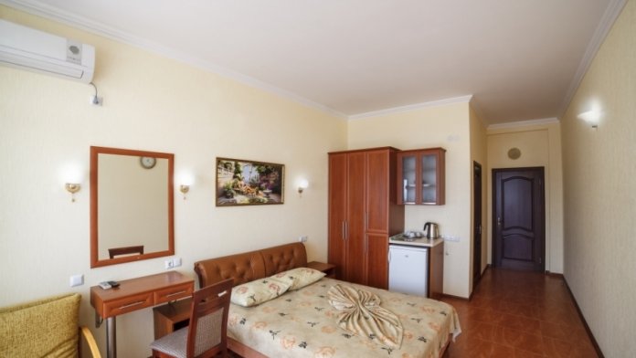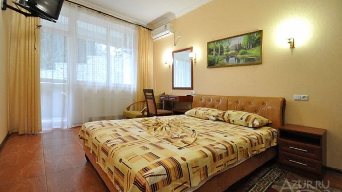 В комнатах отеля сделан ремонт соответствующий европейским стандартам. Есть просторные лоджии позволяющие обозревать прекрасный вид на море и Крымские горы Чатырдаг, Демерджи, город Алушту и парковую зону рядом. Комфортные комнаты распределены по категориям разного уровня финансовых затрат и количеству проживающих в них людей. Помещения состоят из одной, двух, трех комнат, есть достаточно большой площади, что позволяет поселиться семье с детьми, в них имеется до 6 спальных мест. Есть комнаты люкс и полулюкс, а также шикарные апартаменты с видом на море. В комнатах есть отопление и непрерывное горячее водоснабжение. Готовить еду можно самим в апартаментах оборудованых кухней, где есть: холодильник, микроволновая печь, мойка, вытяжка, из мебели - кухонный уголок с уютным диванчиком, кухонный гарнитур, предоставлена посуда и электрочайник.
