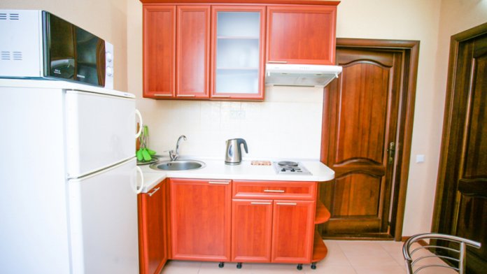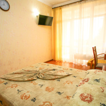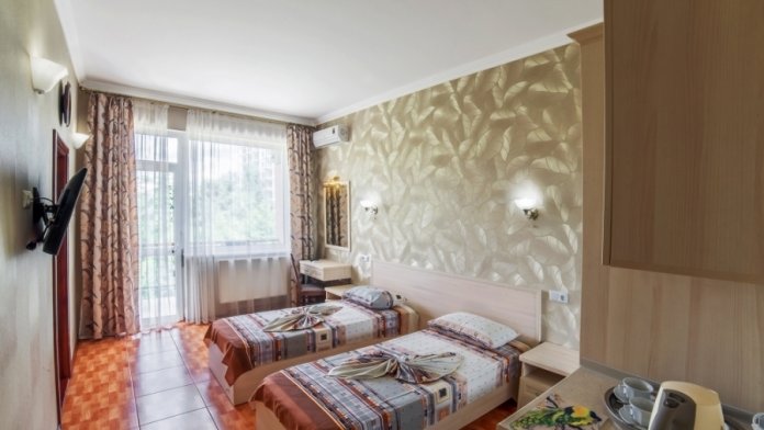 Однокомнатный номер на 2 этаже для двух или трёх человек с кухней и балконом.В номере есть сейф,утюг и гладильная доска.
