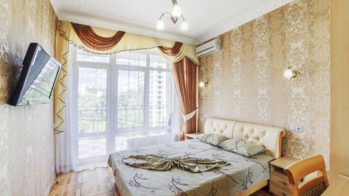 В помещении большая проходная комната и отдельная спальня, 2-4 этаж. Большой балкон.В номере есть сейф,утюг и гладильная доска.