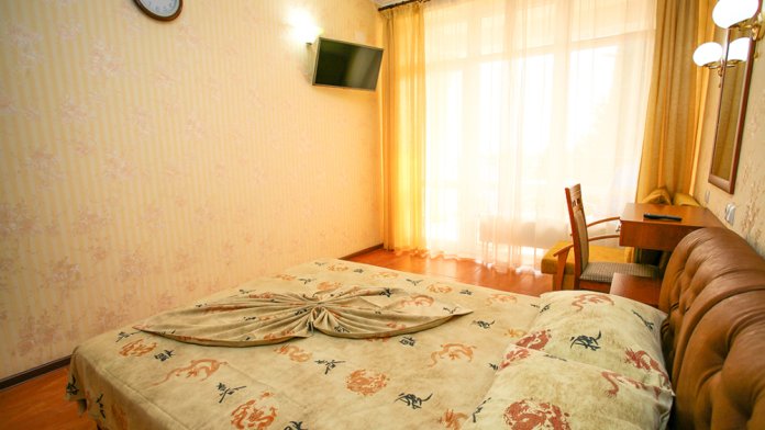 В номере две односпальные кровати(при желании можно сдвинуть). Большой балкон с хорошим видом на парк, город и горы. Номера находятся на 2-5 этаже.В номере есть сейф,утюг и гладильная доска.