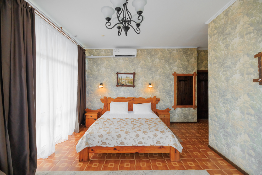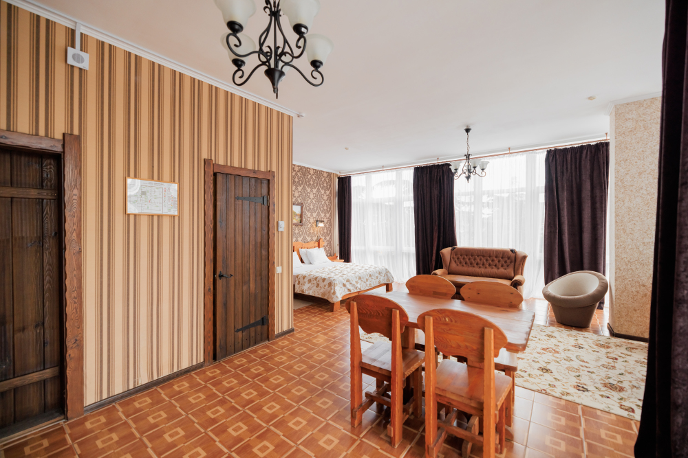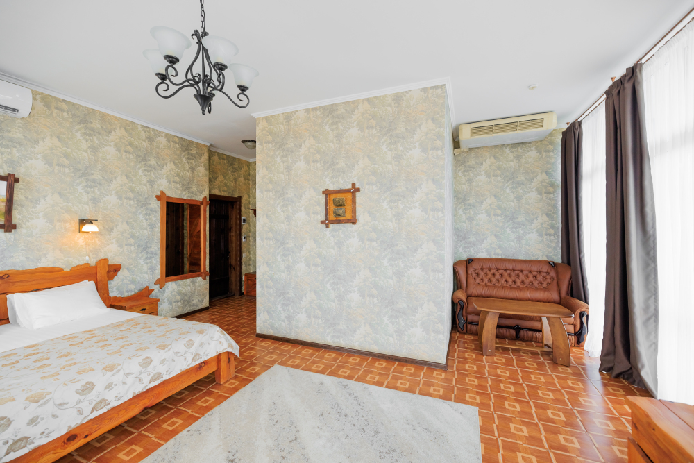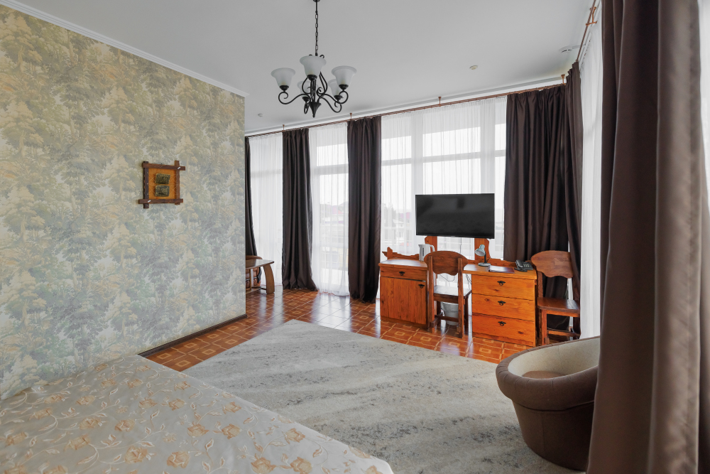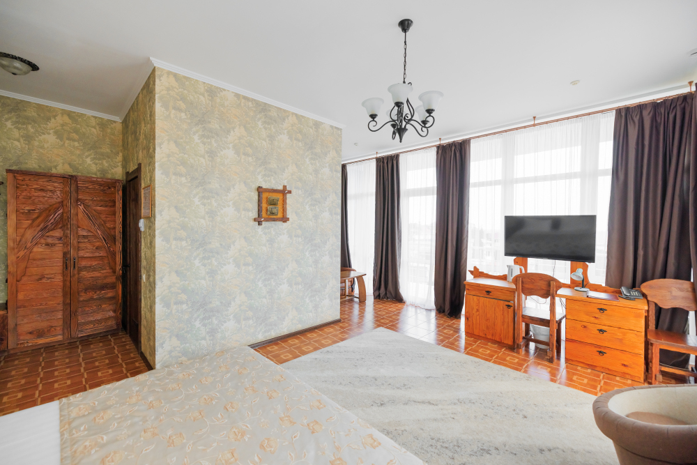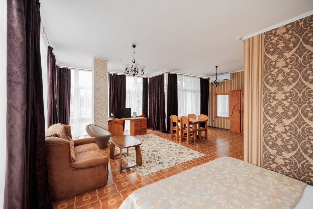 В номере: двуспальная кровать (1800 см х 2000 см), кондиционер шкаф для одежды, журнальный столик, прикроватные тумбы, раскладной диван, стол, стул, чайная посуда, сейф, телефон, LCD телевизор 108 см. по диагонали, Wi-Fi, витражные окна, отдельный балкон с мебелью.