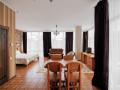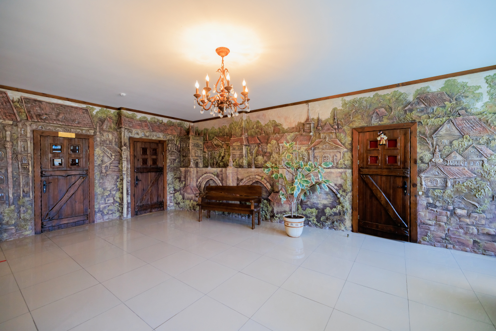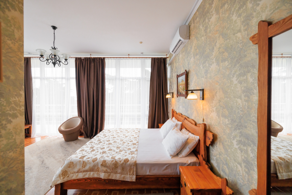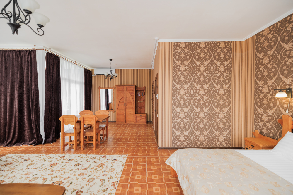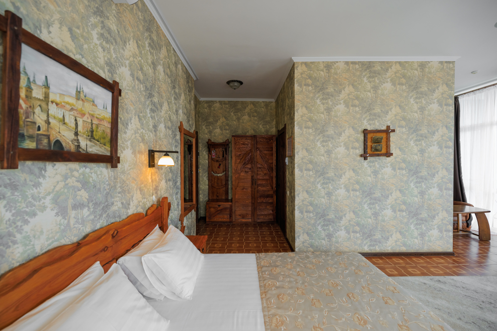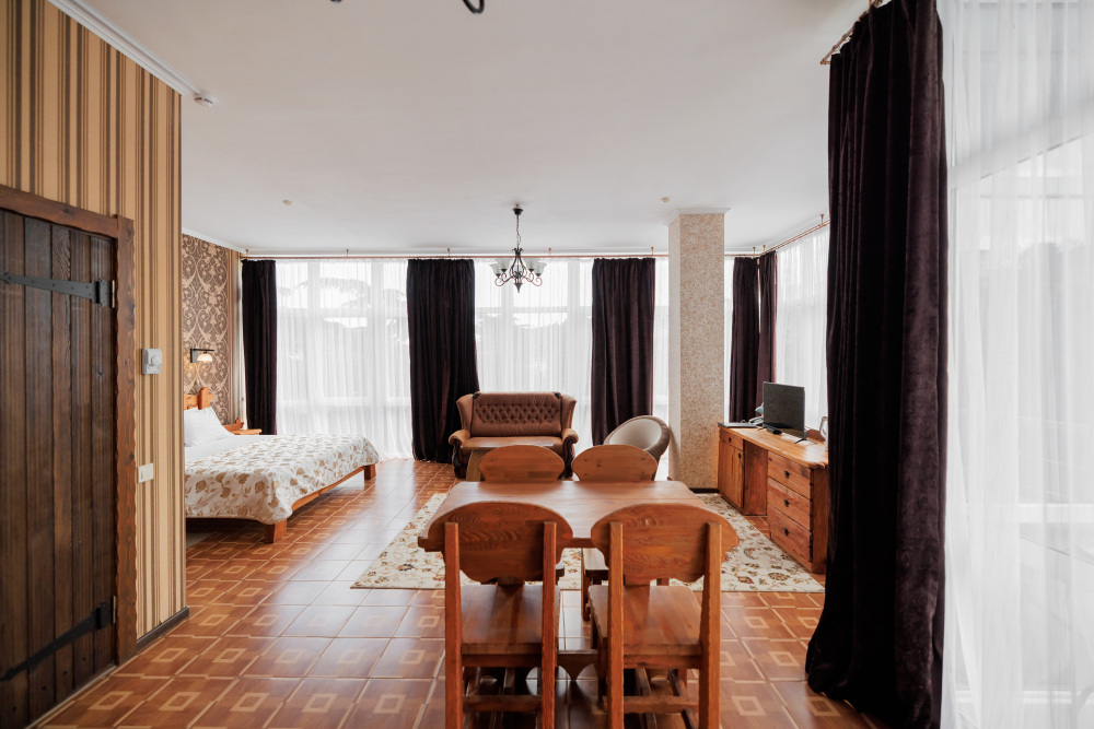 В номере: двуспальная кровать (1800 см х 2000 см), кондиционер шкаф для одежды, журнальный столик, прикроватные тумбы, раскладной диван, стол, стул, чайная посуда, сейф, телефон, LCD телевизор 108 см. по диагонали, Wi-Fi, витражные окна, отдельный балкон с мебелью.