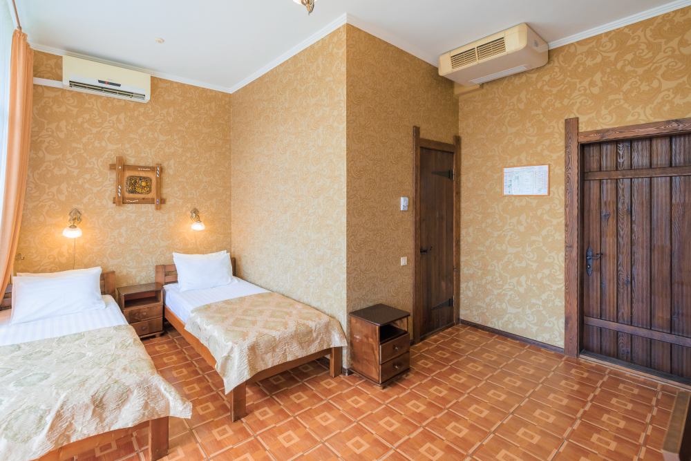 В номере: две односпальные кровати (80 см х 180 см), кондиционер, шкаф для одежды, прикроватные тумбы, стол, стул, чайная посуда, телефон, возможность подключения к интернету через