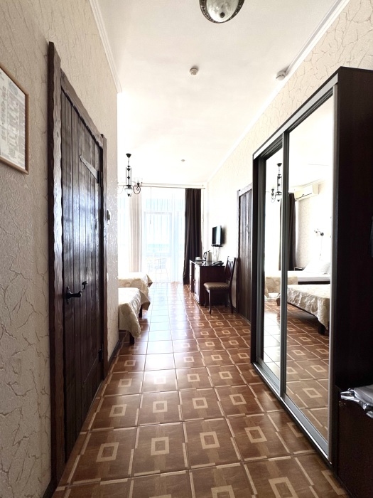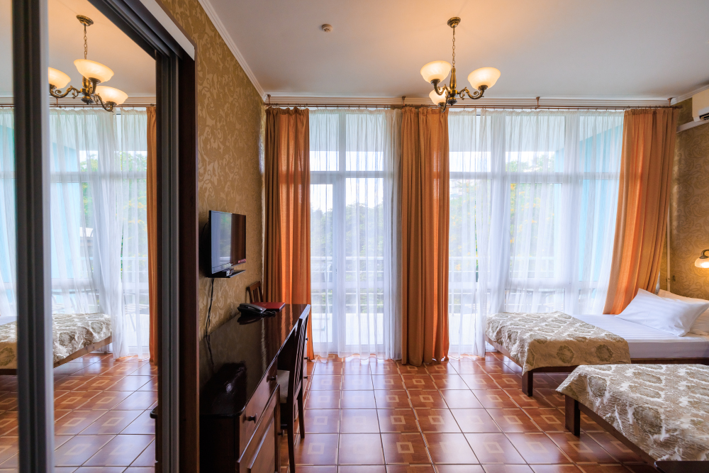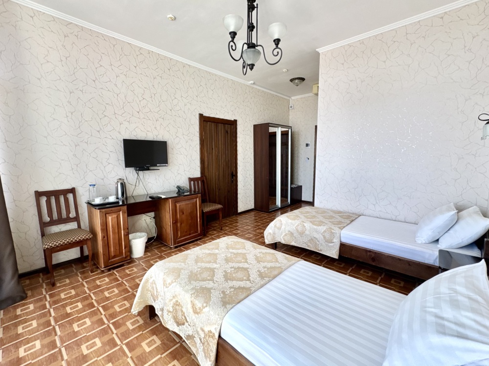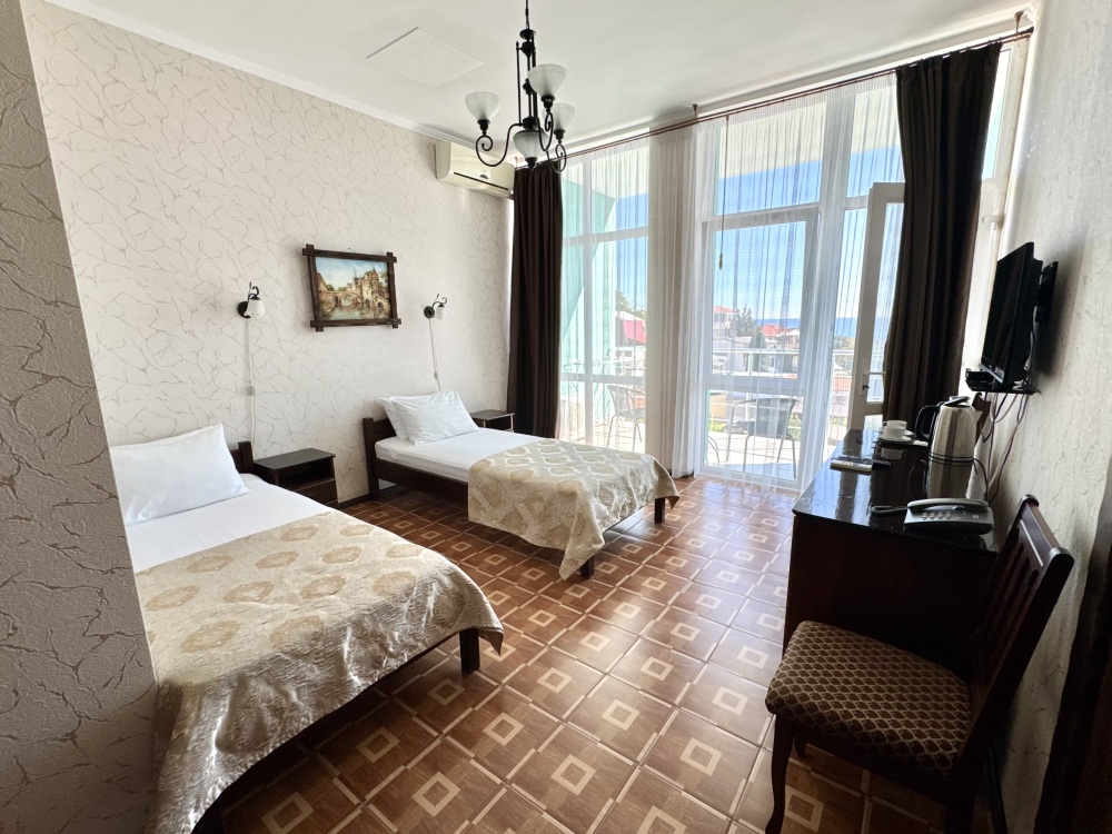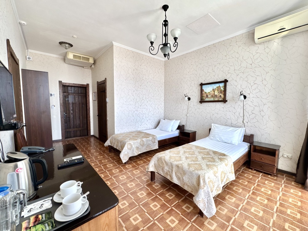 В номере: две односпальные кровати (80 см. х 1800 см.); кондиционер, шкаф для одежды, прикроватные тумбы, стол, стул, чайная посуда, телефон, возможность подключения к интернету через Wi-Fi, отдельный балкон с мебелью.