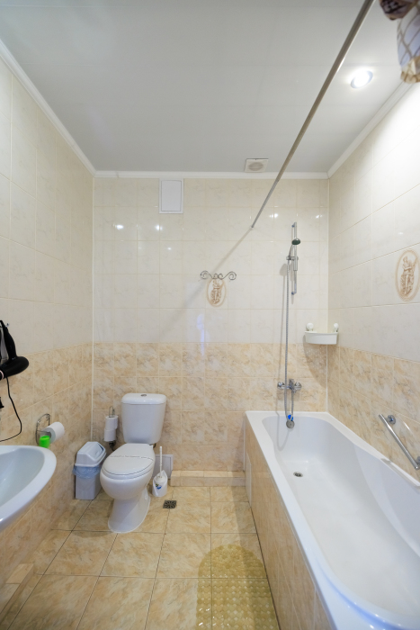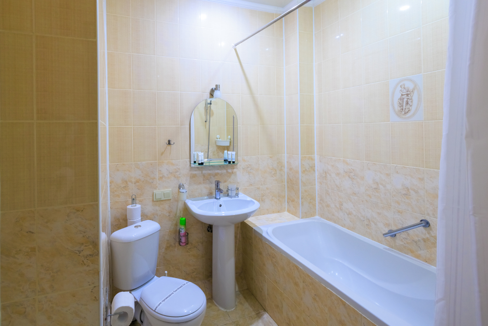 В ванной комнате: зеркало, комплект полотенец, 2 халата, тапочки, косметические принадлежности, коврик для ванной.