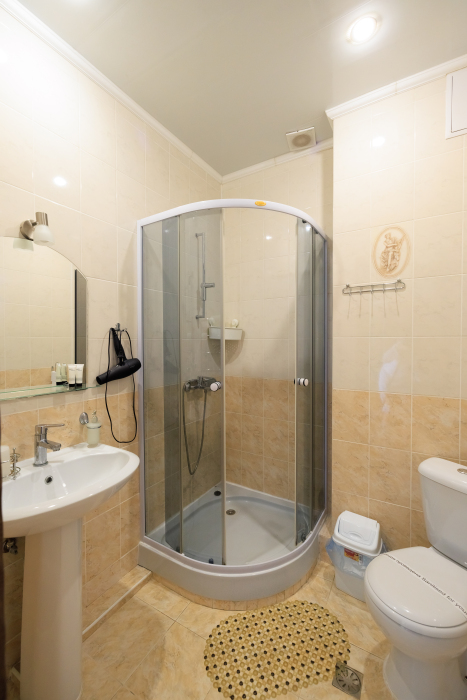 В ванной комнате: косметическое зеркало, комплект полотенец, 2 халата, тапочки, косметические принадлежности, коврик для ванной.
