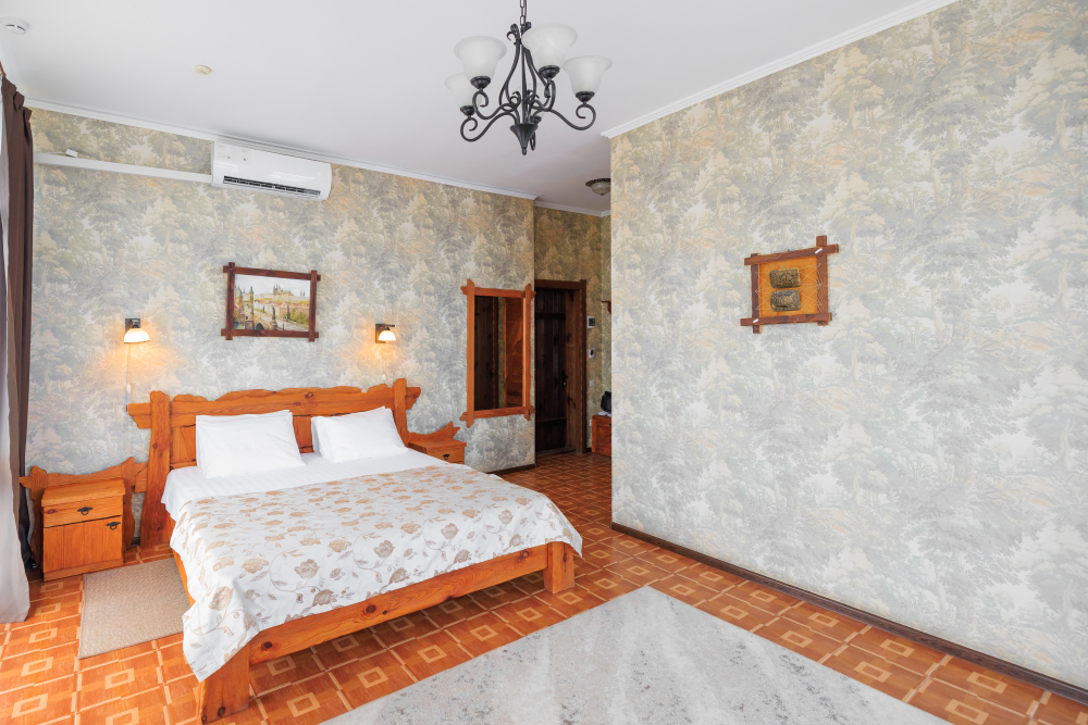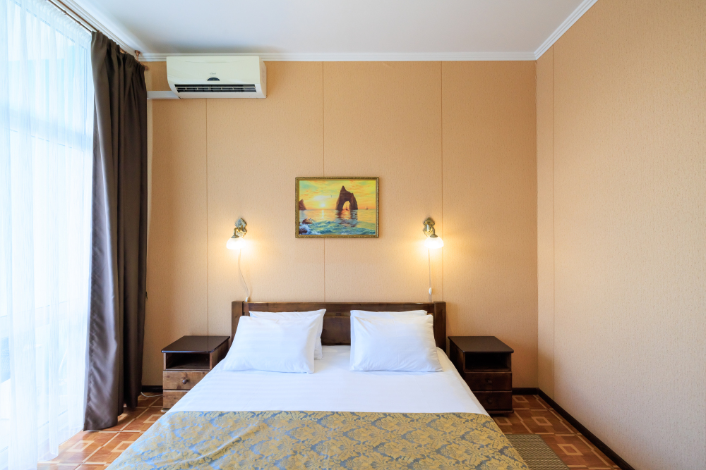 В номере: двуспальная кровать (1800 см х 2000 см), кондиционер, шкаф для одежды, прикроватные тумбы, стол, стул, чайная посуда, телефон, возможность подключения к интернету через