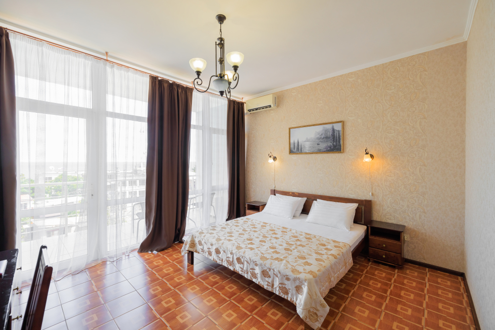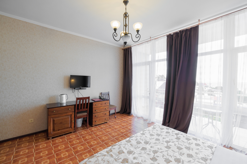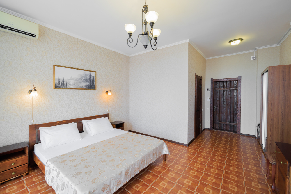 В номере: двуспальная кровать (1800 см х 2000 см), кондиционер, шкаф для одежды, прикроватные тумбы, стол, стул, чайная посуда, телефон, возможность подключения к интернету через Wi-Fi, отдельный балкон с мебелью.