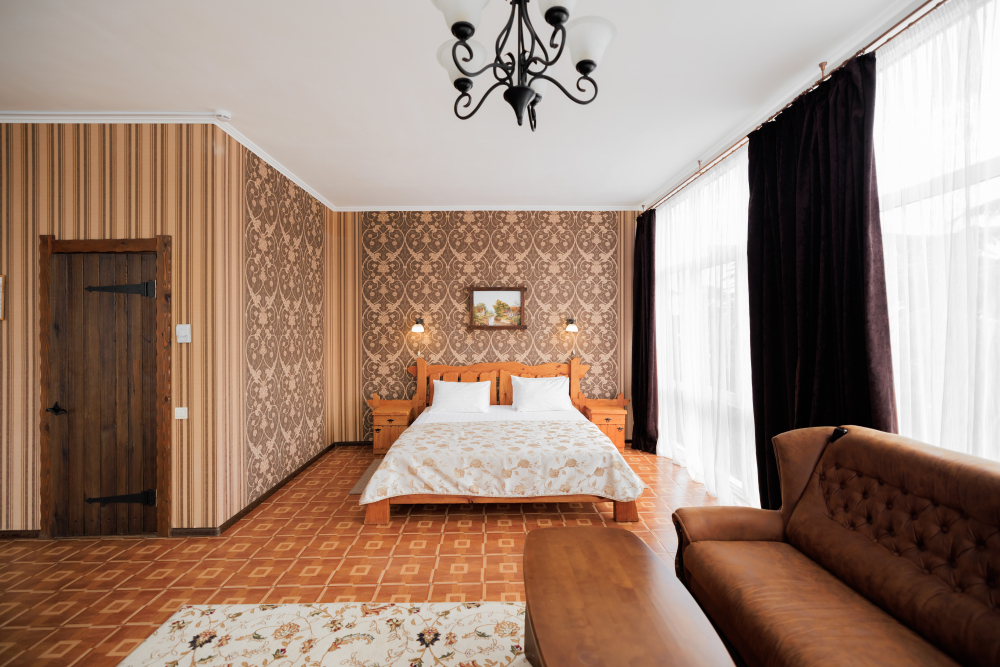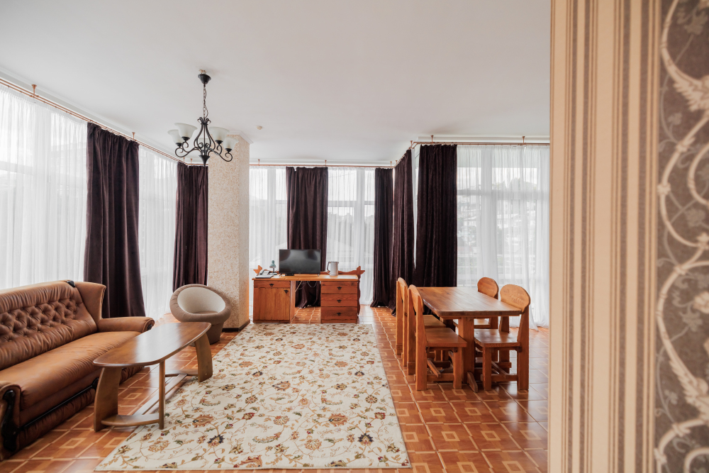 В номере: двуспальная кровать (1800 см х 2000 см),кондиционер, шкаф для одежды, журнальный столик, прикроватные тумбы, раскладной диван, стол, стул,чайная посуда, сейф, телефон, LCD телевизор 108 см. по диагонали, Wi-Fi, витражные окна, отдельный балкон с мебелью.