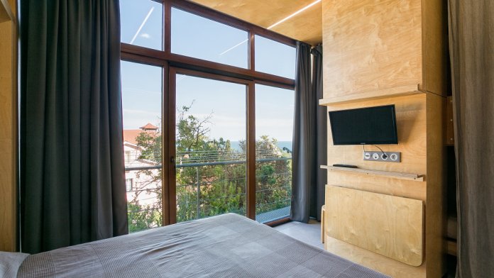 В студии двухспальная кровать и двухъярусная кровати. Оборудована полноценная зона кухни: встроенный холодильник, микроволновка, электрочайник, варочная поверхность, посудомоечная машина, посуда для принятия и приготовления пищи. В санузле бойлер и стиральная машина. Горячая и холодная вода круглосуточно. В летнее время от жары Вас спасет кондиционер, зимой и в межсезонье для комфорта используется теплый пол. Можно ходить босиком. Для комфортного отдыха в квартире имеется утюг, гладильная доска, фен, телевизор,Wi-FI, пылесос. Витражные окна в пол, французский балкон открывают шикарный вид на море и скалу Дива. Можно устроиться перед французским балконом воспользоваться раскладным столиком и за чашечкой кофе или бокалом вина наслаждаться видами на Симеизскую бухту.