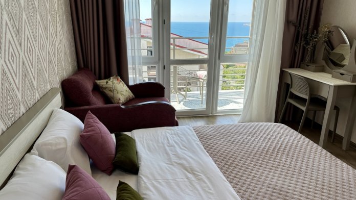 В апартаментах есть большая открытая лоджия с видом на море: а так же панорамное остекление.