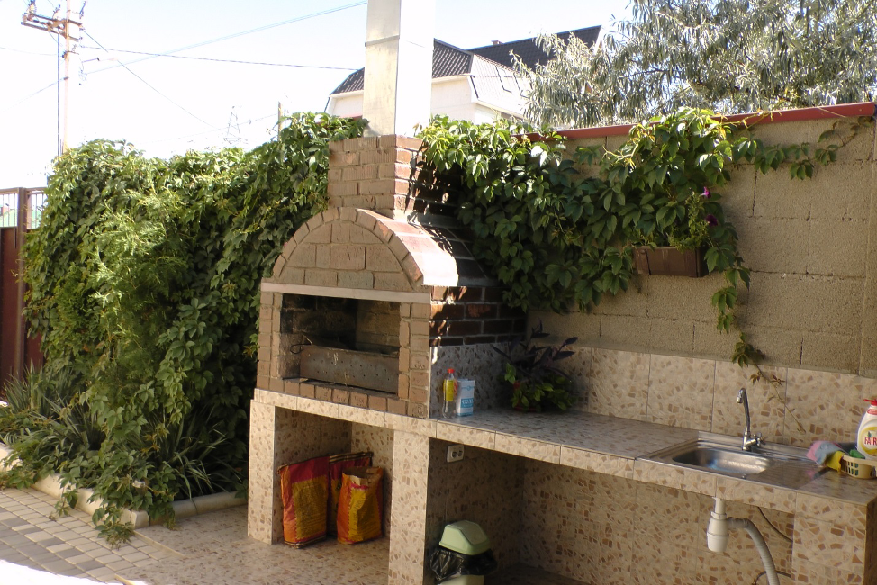 Территория озеленена клумбами с цветами и множеством цветов в горшках. Имеется большая беседка и оборудованный мангал для шашлыков.