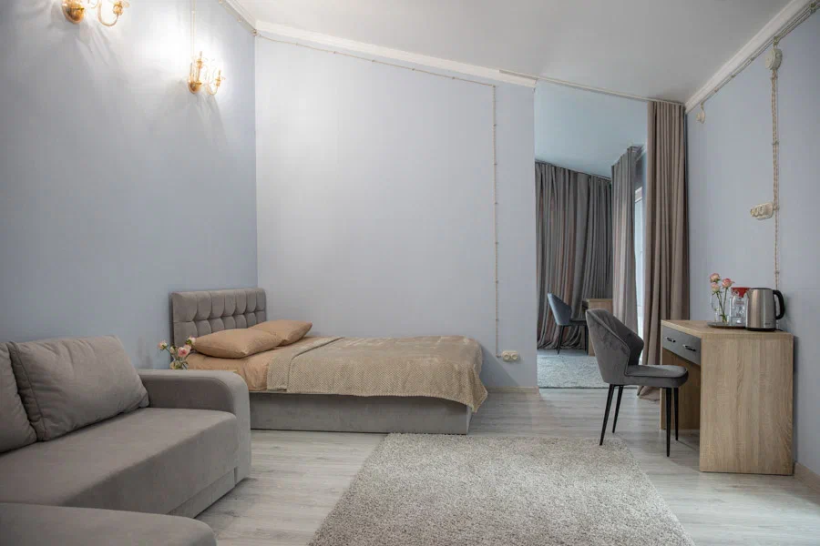 В номере имеется две комнаты в каждой из которых двуспальная кровать. Вторая комната является проходной. Первая комната с выходом на балкон, двуспальная кровать 160х200 см, кресло, прикроватная тумба и столик с выдвижными ящиками. Вторая комната с окно, двуспальная кровать 145х210 см, диван, столик с выдвижными ящиками. В номере отдельный санузел и вместительный шкаф с зеркалом в полный рост. Ванная комната оснащена душем. Фен в каждом номере. 3х разовое питание, Походы в места силы, Психолог, Нутрициолог, Тренер