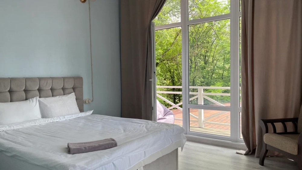В домике имеется две комнаты. Просторная терраса с выходом в дубовый лес или балкон с панорамным видом на горы или лес.