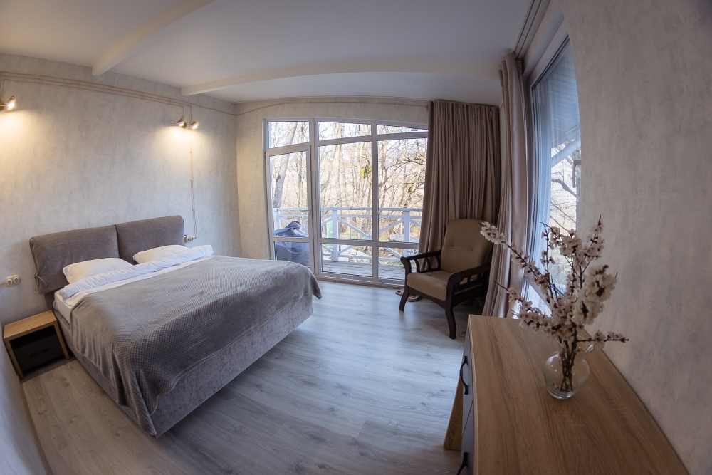 Конфигурация : Двухкомнатный домик с панорамным окном в спальне и выходом на просторную террасу в гущу дубового леса или на балкон с видом на гору Демерджи. Спальня оснащена двуспальной кроватью 160х200 см, креслом, прикроватной тумбой и столиком с выдвижными ящиками. Во второй комнате - двуспальная кровать 140х200, окно в видом на дубовый лес, столик, диван и телевизор 52 дюйма. В номере большой шкаф с зеркалом в полный рост. Ванная комната оснащена душем. Фен в каждом номере. Махровые халаты.