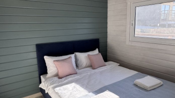 Коттедж в смелых морских оттенках выполнен из натурального дерева с отдельной спальней, кухней-гостиной и душевой комнатой, оборудован собственной террасой с видом на море.