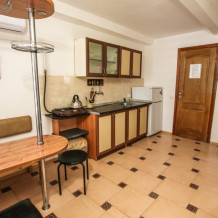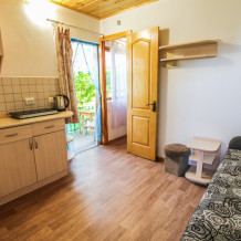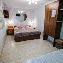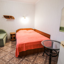 Есть 3 номера данной категории имеющие некоторые отличия.В стандартную комплектацию номера входит: телевизор, холодильник, кровати, диван, тумбочки, шкаф, пуфики, журнальный и туалетный столик. Перед номером личное пространство для отдыха. В каждом номере - санузел (душ, унитаз, умывальник). Горячая, холодная вода все время.
