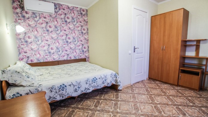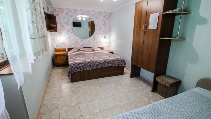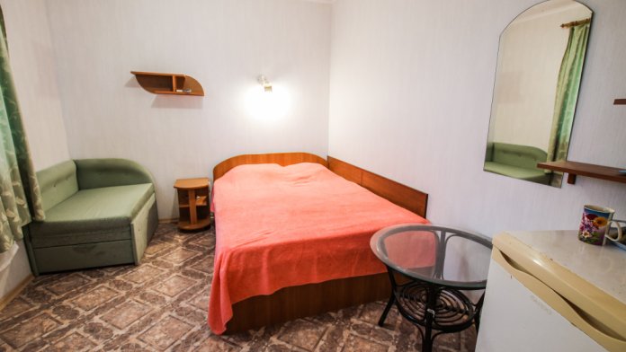 В стандартную комплектацию номера входит: телевизор, холодильник, кровати, диван, тумбочки, шкаф, пуфики, журнальный и туалетный столик. Перед номером личное пространство для отдыха. Санузел (душ, унитаз, умывальник). Горячая, холодная вода все время.
