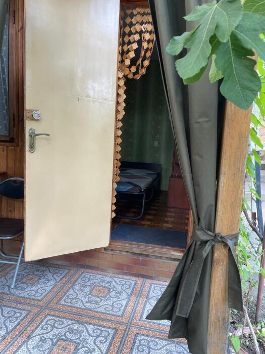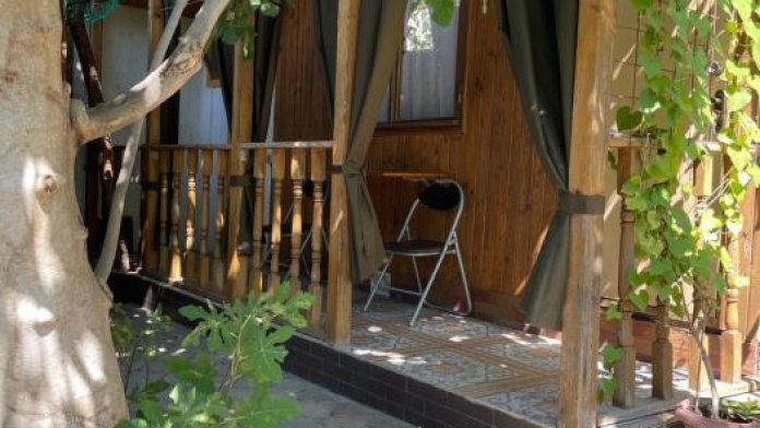 Совмещенная двуспальная кровать, прикроватные тумбы, шкаф с зеркалом, телевизор, дополнительное спальное место (складное), холодильник, кондиционер, электрический чайник, душ (гелиоустановка), раковина с тумбой, санузел, wi-fi. Возле домика есть зона отдыха с садовой мебелью.