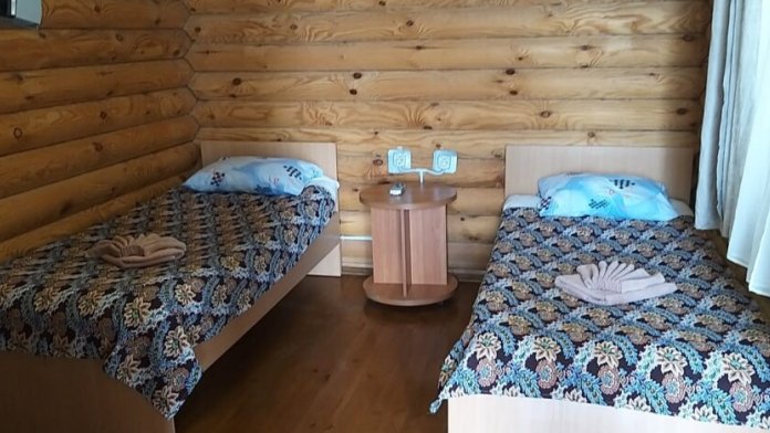 Эконом в сруб: однокомнатный двухместный номер для комфортного и бюджетного проживания с двумя односпальными кроватями, санузлом, кондиционером, горячей водой, холодильником, феном.