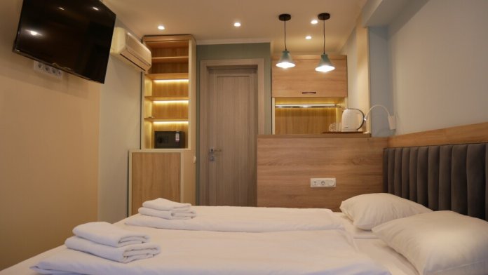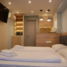 Уникальность цветового решения в номерах располагает к отличному настроению и приятному, романтическому отдыху. Большая двуспальная кровать обещает крепкий здоровый сон. Также в номере имеется раскладывающийся диван, который служит как дополнительное спальное место. Каждый номер оборудован кондиционером, холодильником, телевизором с многоканальным телевидением, WI-FI интернетом. Ванная комната с душевой кабиной оснащена современной сантехникой, горячая и холодная вода круглосуточно. В распоряжении гостей полотенца, фен, мини-парфюмерия.