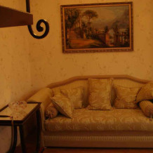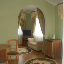 В номере 2-х спальная кровать 160х200, диван, платяной шкаф, телефон, мини-бар, туалетный столик, стол, посуда.