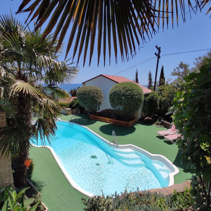 Отдыхали на вилле в начале июля. Снимали отдельный домик. Очень удобно для семьи. Из окон видно море. Красота! Всё очень понравилось. Владельцы Татьяна и Николай очень гостеприимные, доброжелательные люди. Территория шикарная, ухоженная. Питались на территории. Домашняя кухня. Повар очень вкусно готовит. Цены приемлемые. Бассейн просто класс. Очень спасал в жару и когда началась море было много медуз.