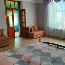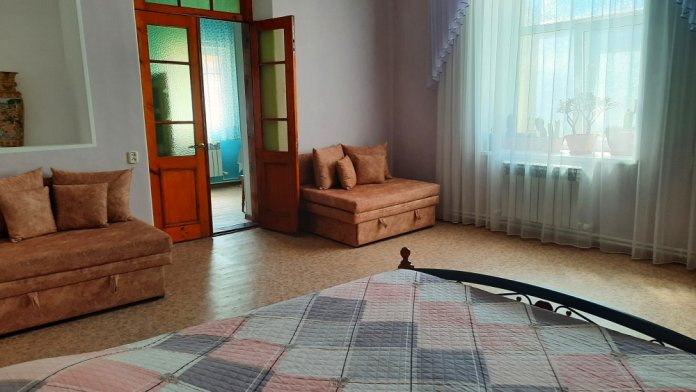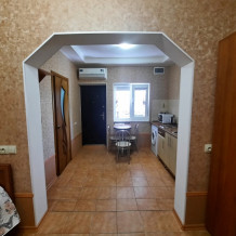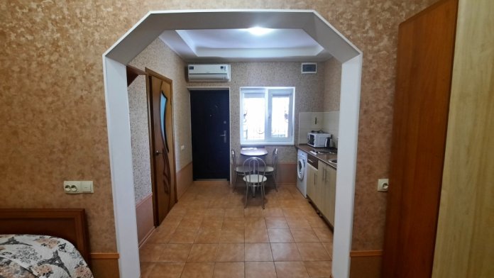 Две изолированные комнаты и проходная кухня-гостиная: двух спальная кровать, три раскладных дивана (пять полноценных спальных мест), шкаф, два телевизора, два кондиционера, кухонный уголок, посуда, холодильник, газовая плита, микроволновая печь, стиральная машина, утюг, фен, wi-fi. Сан узел, душевая кабина. Горячая и холодная вода круглосуточно. Автономное отопление позволяет комфортно отдыхать и в зимний период. При входе столик и стулья. Уборка, смена постельного белья и полотенец бесплатно, один раз в неделю.