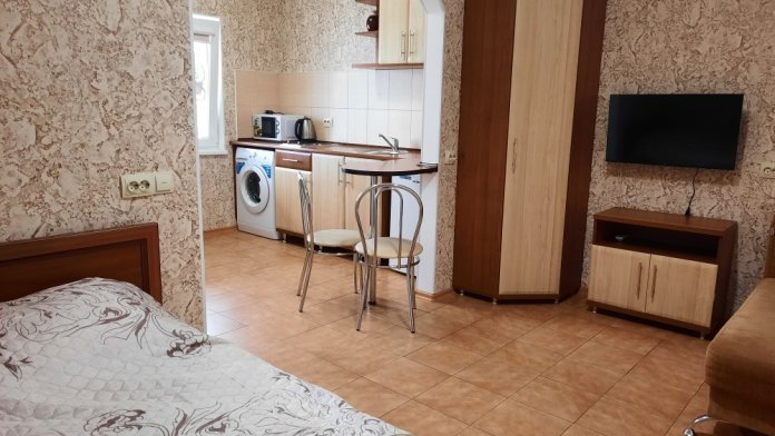 Есть все для комфортного отдыха. Большая двухспальная кровать и раскладной диван-тубус (три полноценных спальных места), шкаф, кухонный уголок (вся необходимая посуда), телевизор, кондиционер, утюг, фен, электрическая плита, микроволновая печь, холодильник, электро чайник, стиральная машина, wi-fi. Горячая и холодная вода круглосуточно. При входе столик и стулья. Уборка, смена постельного белья и полотенец бесплатно, один раз в неделю.