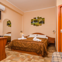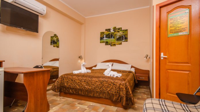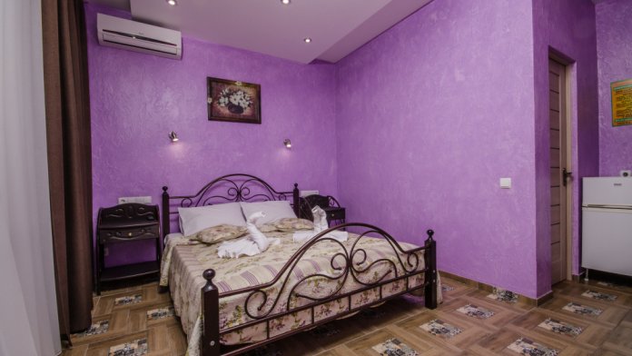 Укромный дом скрыт от посторонних глаз. Во дворе дома под кроной деревьев можно приятно провести вечер. Гости могут воспользоваться оборудованной кухней , для самостоятельного приготовления пищи . Посмотрите фотографии и убедитесь, как уютно в нашем дворе! В гостевом доме восемь двухместных номеров. Все номера просторные, светлые, уютные, оснащенные современной мебелью и техникой. В каждом номере санузел. Номера подходят для семейного отдыха с детьми, т.к. в каждом номере кроме просторной двуспальной кровати есть раскладной диван.