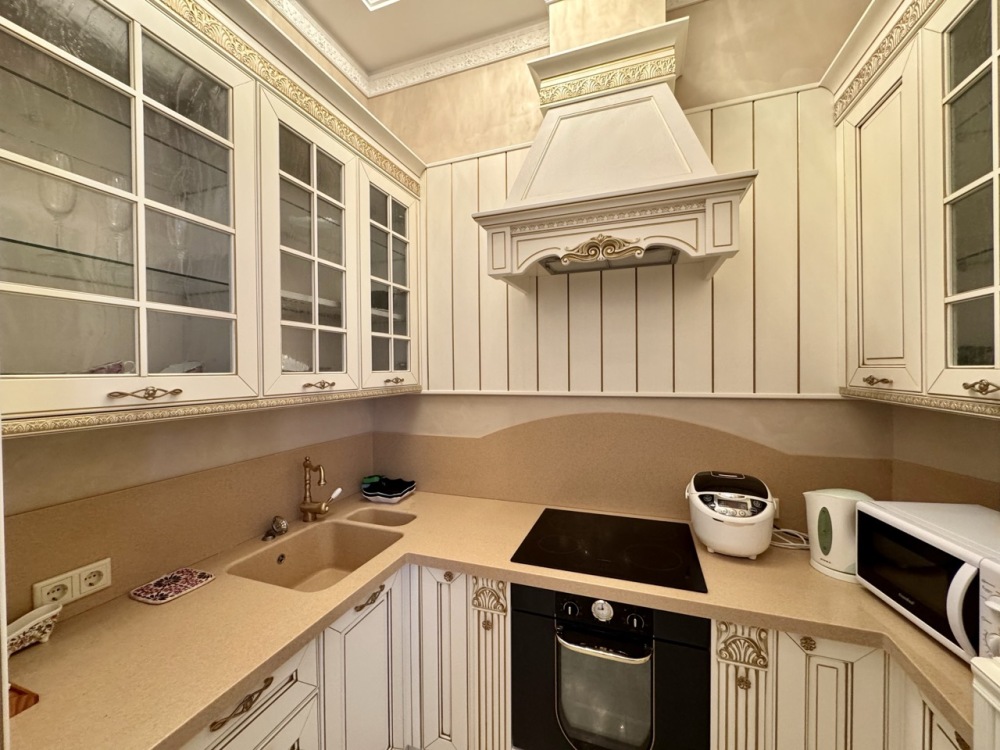 - Гостиная-кухня: Мягкий двуспальный диван, большой ЖК-телевизор, обеденный стол, вместительный шкаф. Кухня полностью укомплектована современной техникой: 4-комфорочная плита, духовка, большой холодильник, микроволновка, мультиварка и вся необходимая посуда.