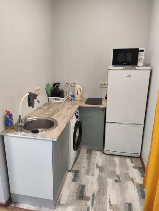 Техника на кухне: большой холодильник, электроплитка, электрочайник, микроволновка.