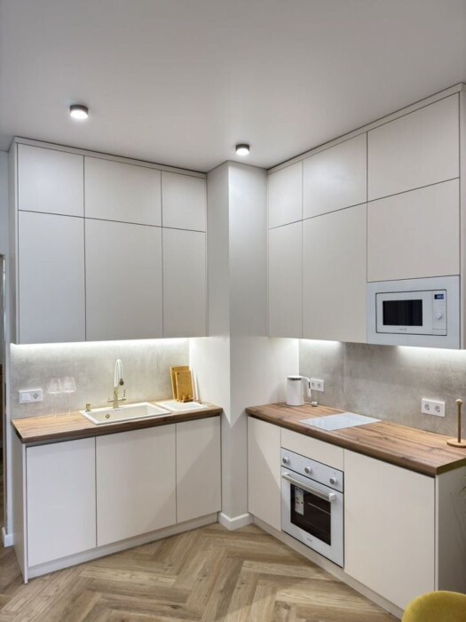 Техника на кухне: большой холодильник, индукционная плита, электрочайник, микроволновая печь, система очистки питьевой воды.