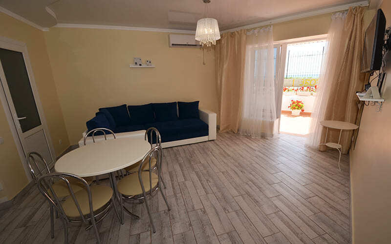 В апартаментах Вы найдёте кондиционер, полностью оборудованную кухню, телевизор с плоским экраном. В ванной комнате есть душ и бесплатные туалетно-косметические принадлежности. На территории есть мангальная зона и терраса. Собственный песчаный пляж оснащён навесами и качелями, что делает отдых ещё более приятным.